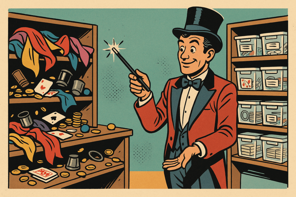 Einheitliche Größen für bessere Übersicht: Drei bis vier verschiedene Boxengrößen reichen völlig aus. Mehr verwirrt nur. Eine kleine für Münztricks, eine mittlere für Kartentricks, eine große für Bühnenmaterial. Fertig. Alles andere macht das System nur kompliziert.